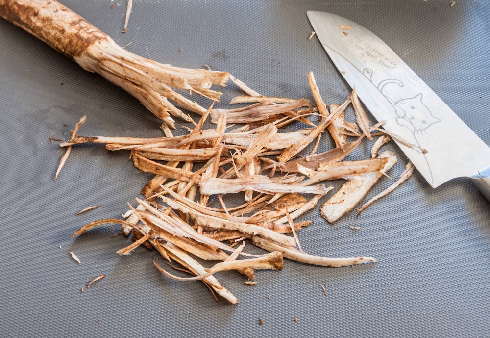 2. Fill a medium bowl with cold water, add the vinegar and set aside. Make several vertical cuts about 5 to 7 centimeters into the end of the burdock root. Lay the cut end of the burdock root on a cutting board, then shave the cut parts as if you were sharpening a pencil using a knife or a vegetable peeler — this style of slicing is called sasagaki. Put the shavings into the bowl of water and vinegar, which stops them from darkening. Leave them to soak for five to 10 minutes.