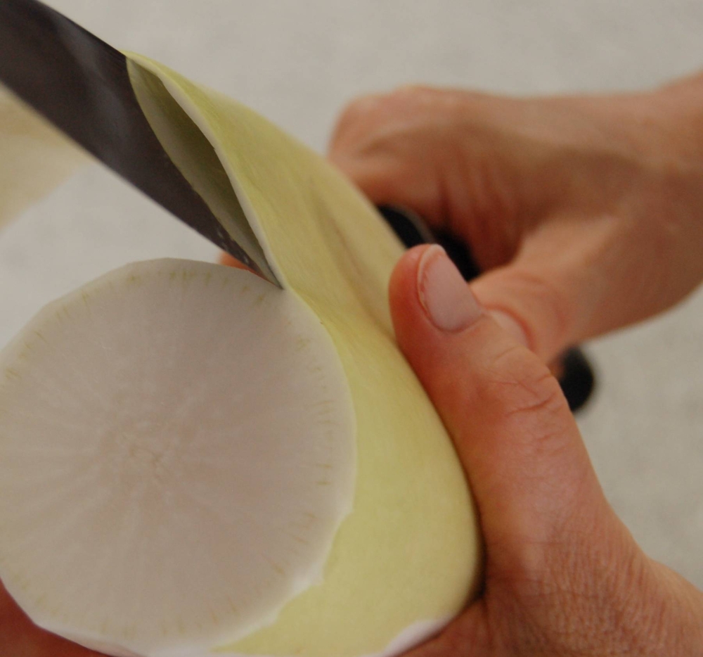 Continue peeling with up-and-down motions with your dominant hand while rotating the daikon into the knife blade. The daikon should be coming off in a continuous peel, which can be set aside, thinly slivered and cooked the same way as burdock root in kinpira.