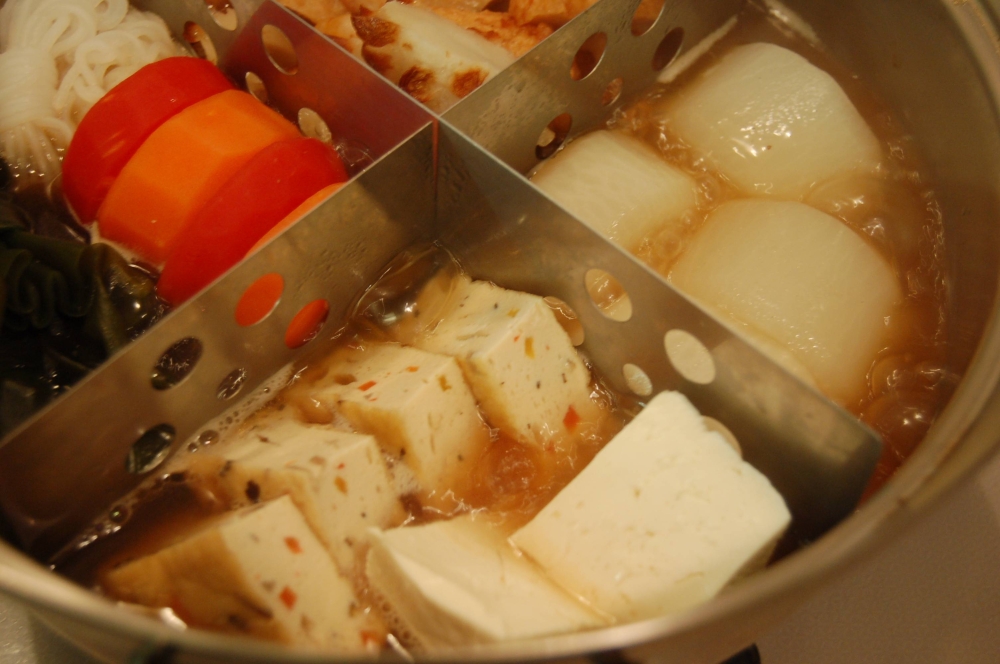 Just before serving, reheat slowly until the stock is barely simmering. Serve with karashi mustard.