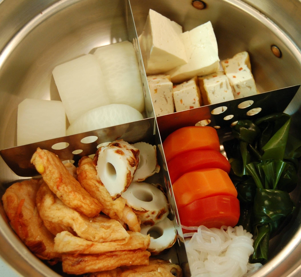 Gather your various oden items — chikuwa, satsuma-age, tofu, ganmo, itokon and nama kombu — and pack them snugly in a wide, shallow pot. You can cluster your items all together, but there are special inserts called shikiri ita (dividers with holes) that allow simmering liquid to move freely from one compartment of a divided pot to the other. Sold for just a few hundred yen online and in housewares sections of large department stores, these dividers transform an ordinary pot into an oden nabe (pot used specially for oden).