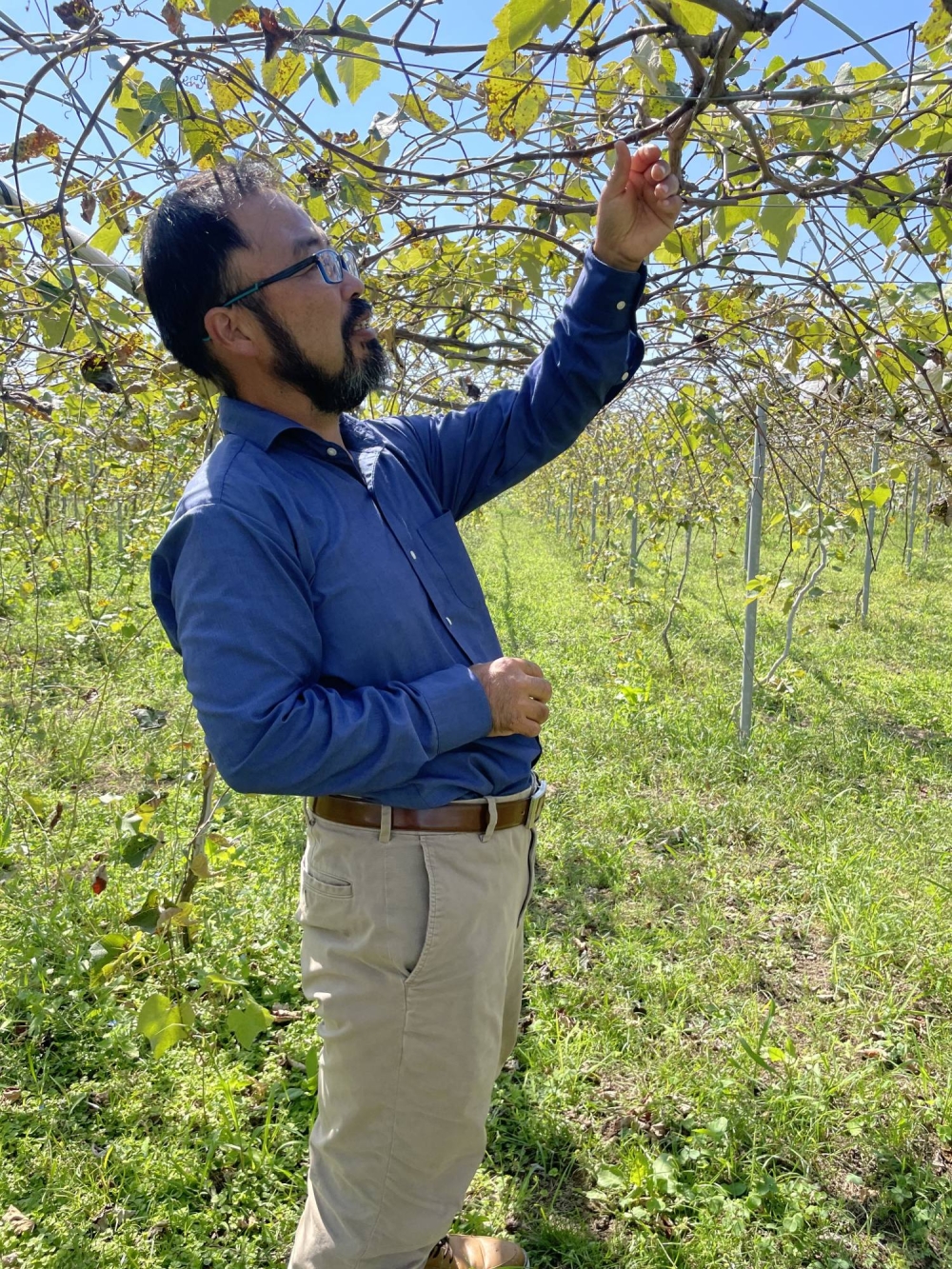 Starting with traditional European-style varietals such as chardonnay, merlot and pinot gris, he began planting wine grapes in 2013 in the rich, black volcanic soil that blankets the Nishikibaru Plateau where his fields are located. Finding that they did not do well in the wet climate, he decided to experiment with Japanese table grapes such as Kyoho and Black Olympia, which were more suited to local conditions.
