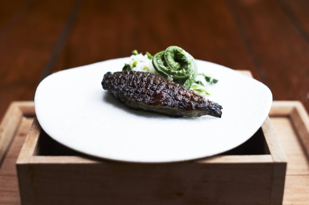Another fish that Hagi likes to work with is mehikari (greeneyes). Commonly found in the ocean depths off the coast of Fukushima, it is considered the official fish of Iwaki City. He fillets and sears them lightly, pairing them with a sauce prepared from sake lees and foraged edible wild plants, such as the gently bitter young leaves of the koshiabura tree.