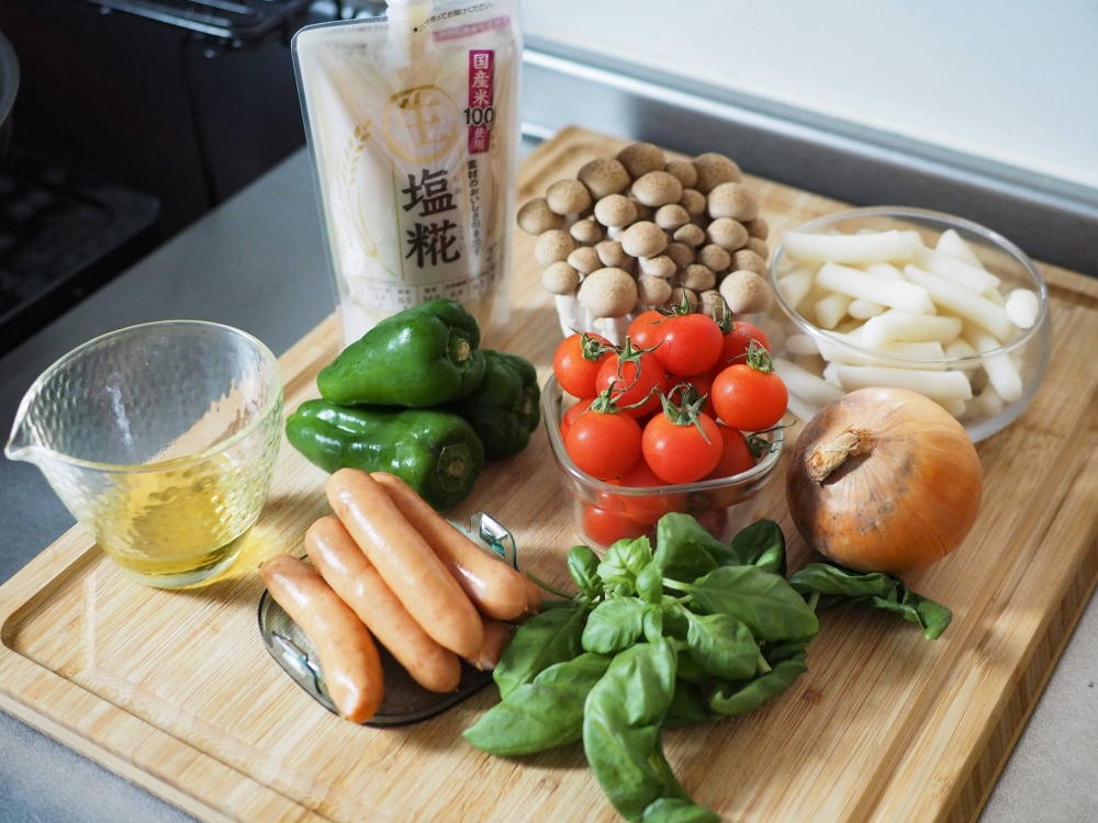 The modern napolitan is often maligned for incorporating ketchup, though early recipes were in fact based on tomato puree. In this recipe, cherry tomatoes take its place, with sausage, onion, mushrooms and green pepper in tow, as is tradition. Any mushrooms will do, but bunashimeji (brown beech mushrooms) are easy to work with.