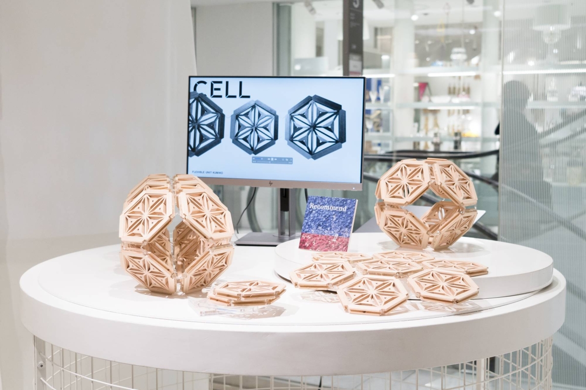 For her latest project, Cell, Suzuki collaborated with woodwork artisan Takahiro Tanaka to reimagine a classic kumiko pattern: tessellated hexagons. Her design deconstructs the pattern into individual 35-by-35-cm hexagonal units that can be connected by slim, transparent thermoplastic polyurethane hinges. The introduction of flexible joints allows designs to shift and move to transform tessellations into three-dimensional forms like polyhedra and columns.