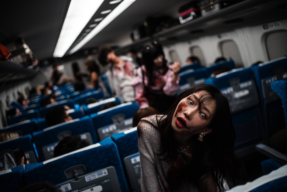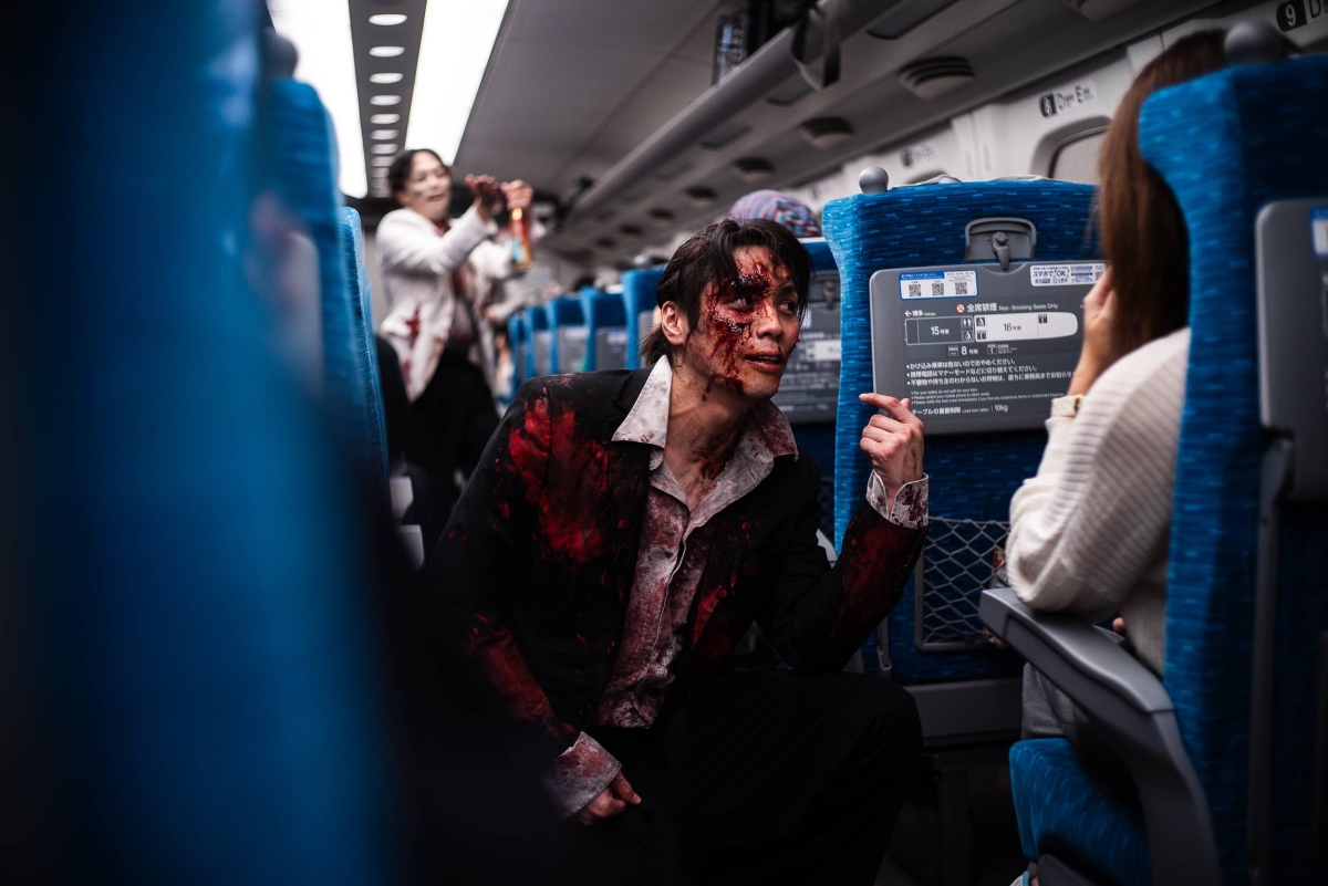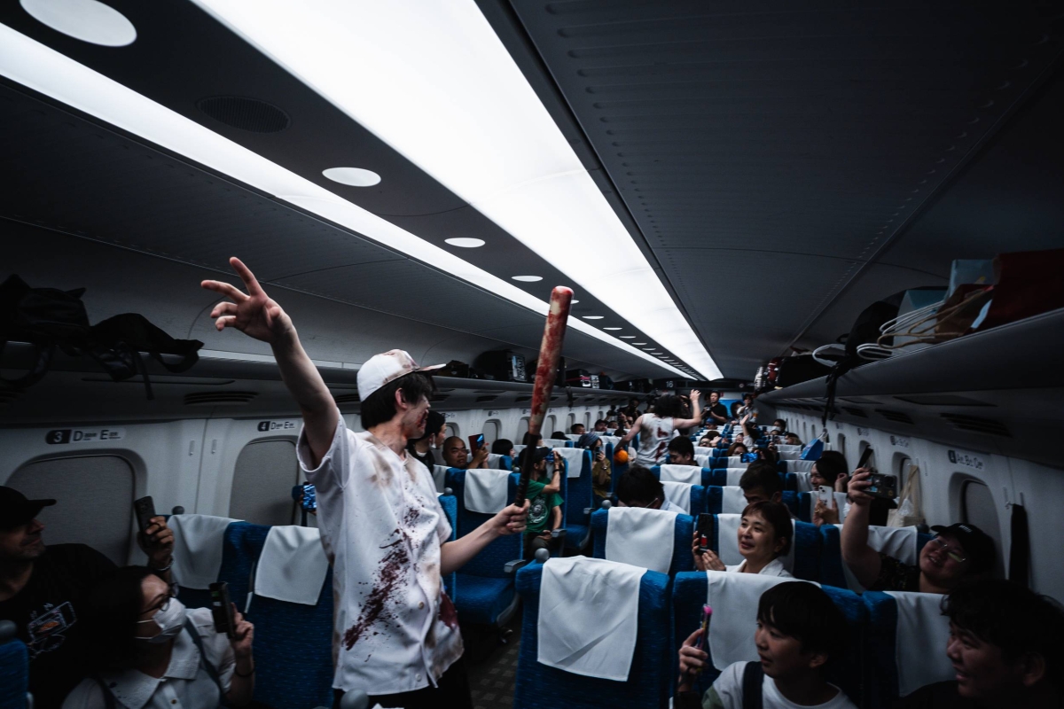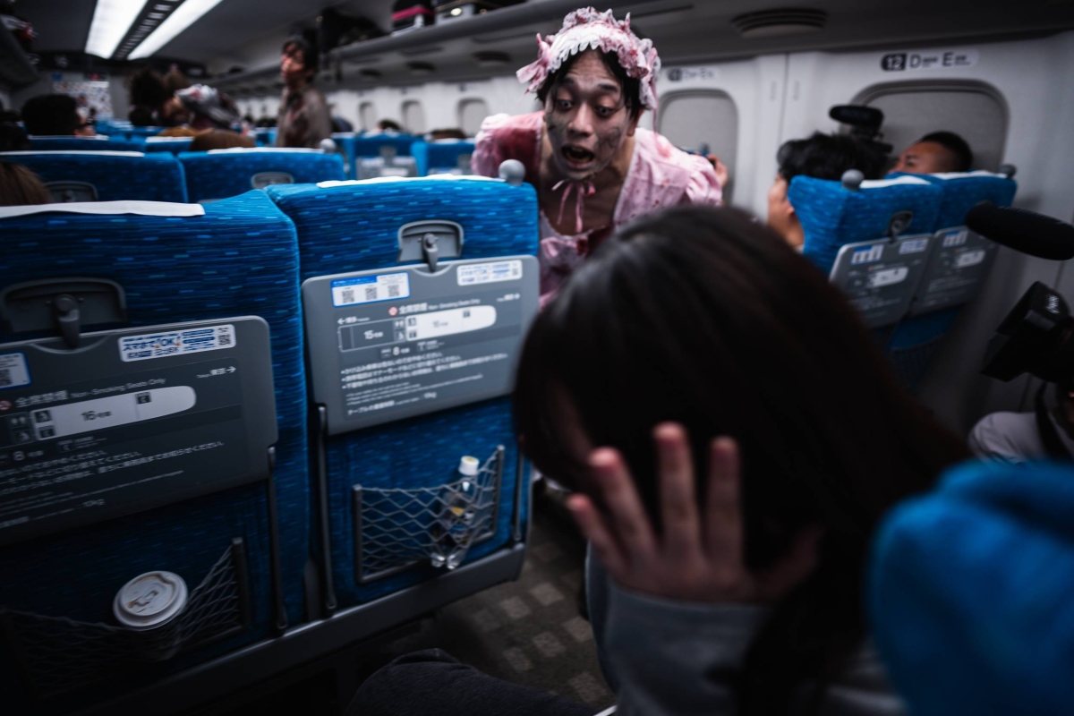 On Oct. 19, there was an official takeover of one car on a regularly scheduled train from Tokyo to Shin-Osaka Station, put on by event planning organization Kowagara Setai and which about 40 horror fans paid up to ¥50,000 to attend. You may have seen “Train to Busan,” the hit South Korean movie the event draws its inspiration from, but watching it unfold before you is another thing entirely. That it’s happening on the world’s safest form of transport, in a country renowned for its order and cleanliness — during a month the shinkansen celebrated its 60th anniversary, no less — compounds its unsettling outlandishness.