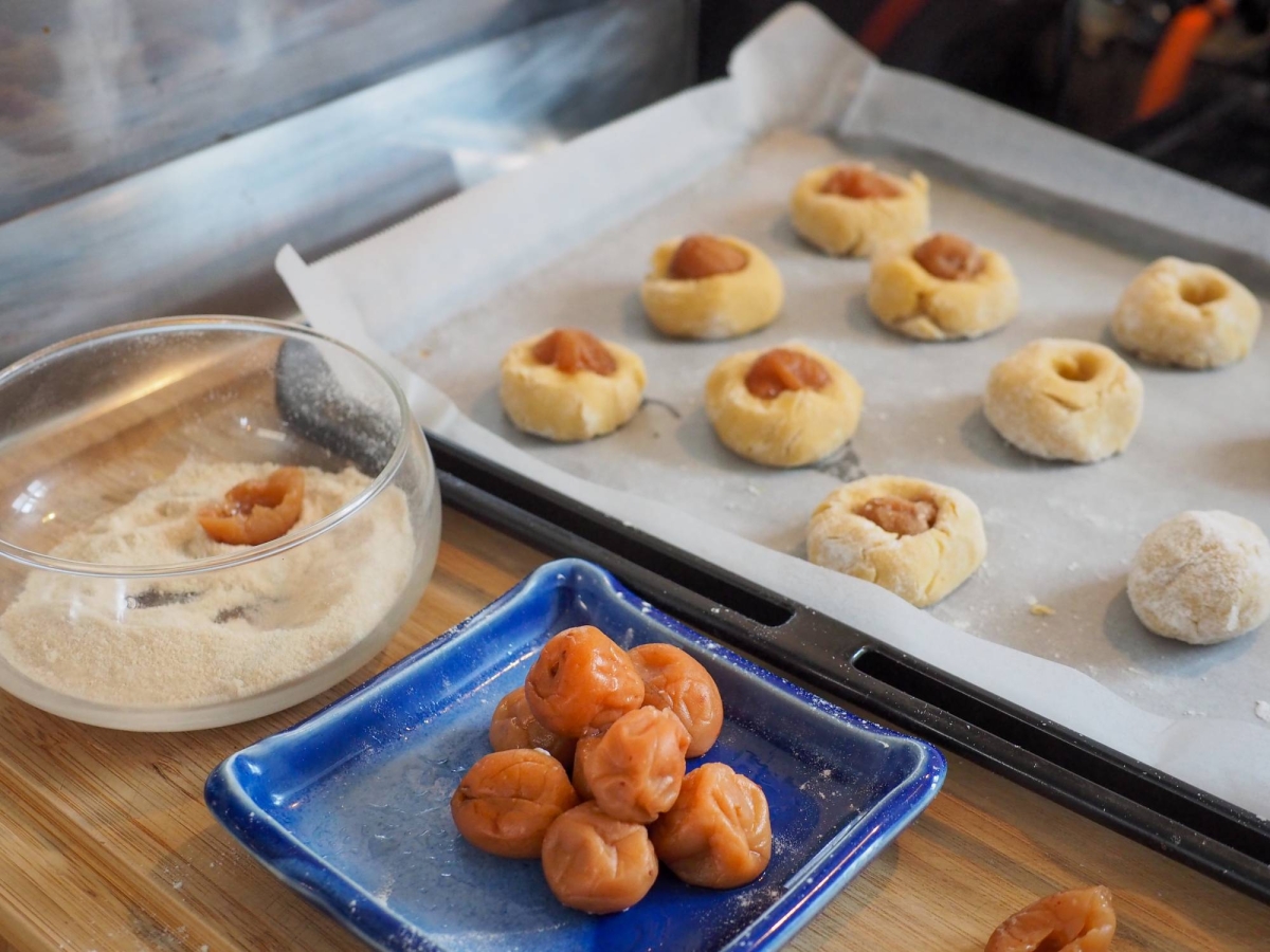 4. Squeeze each umeboshi and pop its pit out, then add one umeboshi into the indent of each cookie. For a less fruity punch, use only half an umeboshi per cookie.