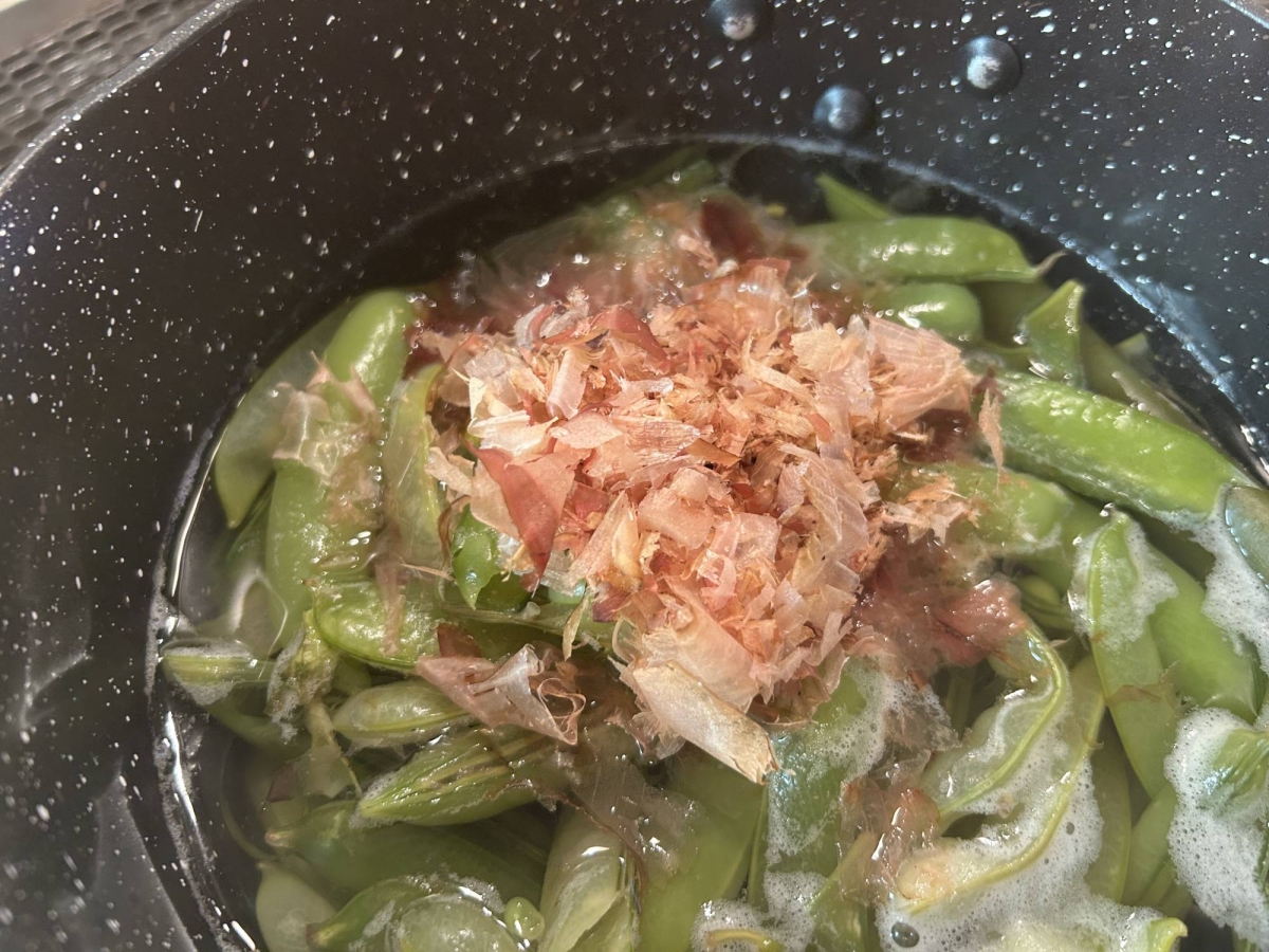 Remove the pot from your stove and add the katsuobushi flakes but do not stir. Instead, let them steep for five or six minutes, then strain the stock through a cloth-lined strainer. Discard the solids — pea pods, spent kombu and katsuobushi flakes — you should be left with about 450 milliliters of golden-hued, slightly smoky stock, fragrant with fresh peas.