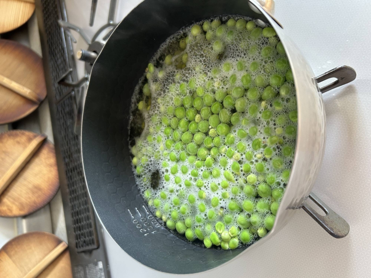 Wipe the pot with a paper towel to remove any residue that might be clinging to the sides before returning the strained stock to it. There’s no need to wash the pot; any residual essences will boost the flavor of the final soup. Add the shelled peas to the pot and cook them for one minute after small bubbles appear. Remove the pot from the stove and let the residual heat continue to cook the peas.