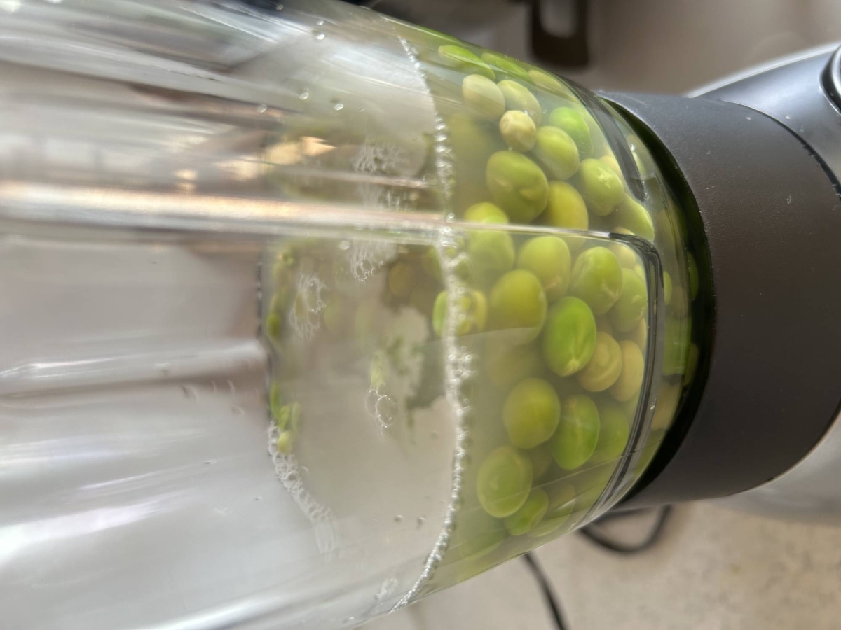 While the peas cool slightly, finely mince the green onion or chives for garnish. If a slippery substance appears, don’t worry — that’s allicin, the enzyme responsible for the onion-y aroma. It will help thicken the soup and keep it from separating. Set aside the garnish.
