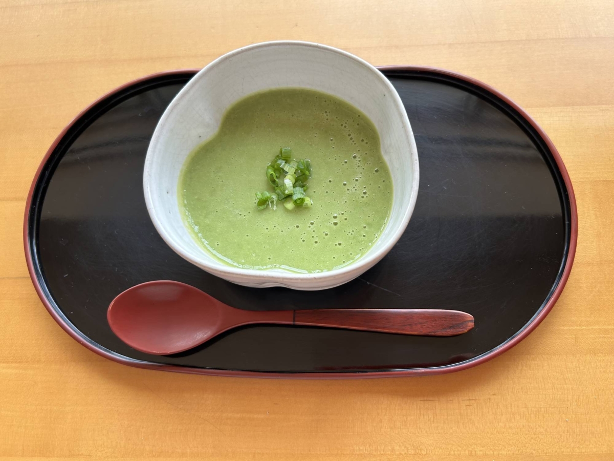 On Japanese menus, pureed soups called surinagashi-jiru (literally, “grind, pour, broth”) are a great way to showcase seasonal produce. In May, that means tender, verdant peas will be what gives these soups their flavor. In keeping with the washoku (traditional Japanese cuisine) tenet of using ingredients fully — even the pods that are often discarded after shelling will be used to enhance the taste of the dashi stock.