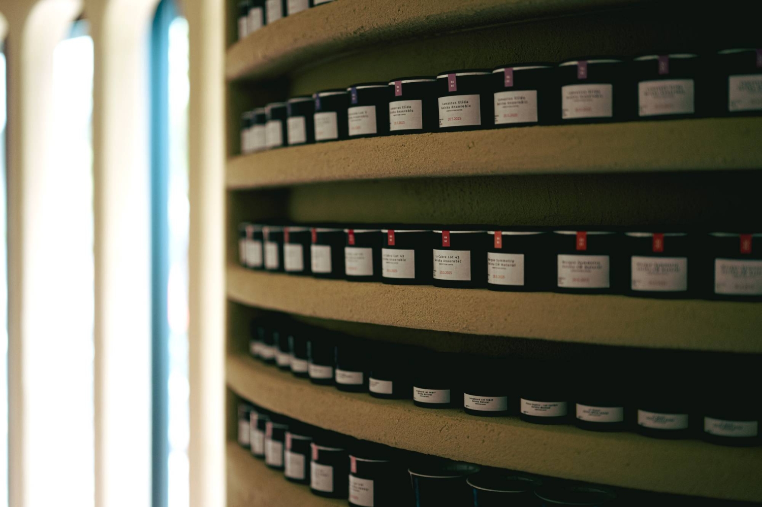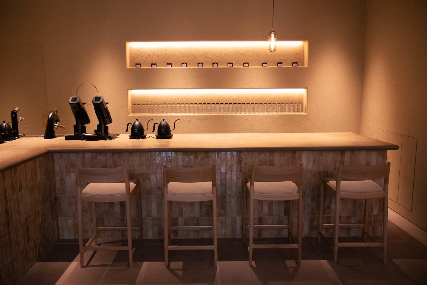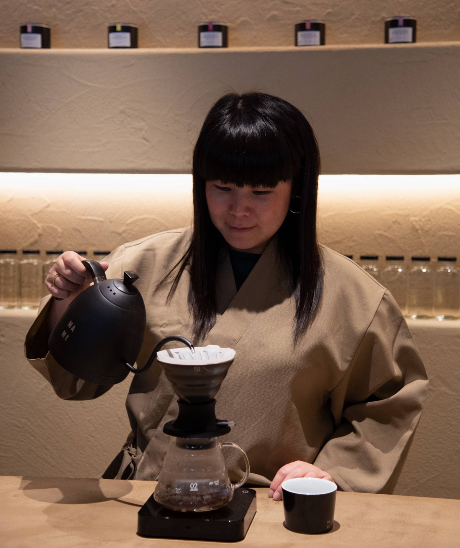 Equally serene is Kuro Mame’s setting. Sand-colored, curved walls wrap the space in a warm embrace, with recessed shelving displaying canisters of coffee beans, most of which Fukahori imports herself. A chocolate-brown curved banquette lines the far wall, shaped like a chapel apse, while soft leather chairs face slender oval-shaped windows. From one shelf, a golden coffee pot — the trophy from Fukahori's win at the 2018 World Brewers Cup championship — catches the light.