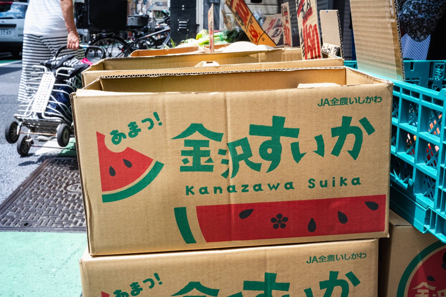 This summer, watermelon — one of the more ostentatious, high-risk, high-reward fruits consumed by humans — was a domain of stiff competition at the market. The boxes for Yairokko-branded watermelon from Niigata Prefecture came with an ornate pale green and white wash, mimicking the outside of the rind. Watermelon boxes from Kanazawa were more smooth and graphic but no less thoughtful; one of the black seeds shown in the flesh of the red fruit doubles as a kaga umebachi, a symbol of the city in Ishikawa Prefecture.