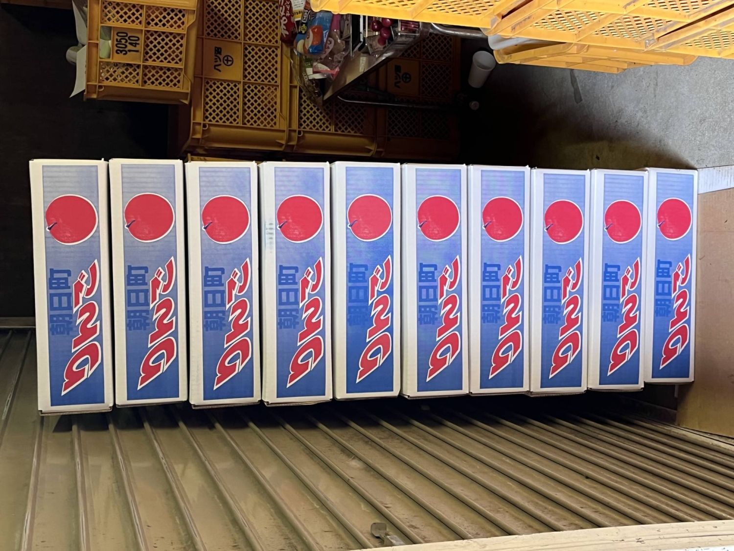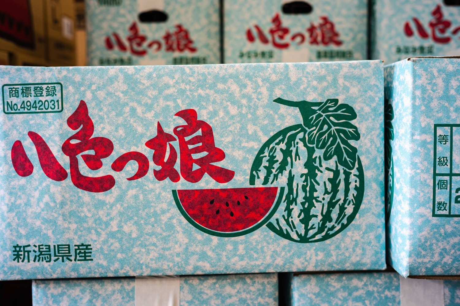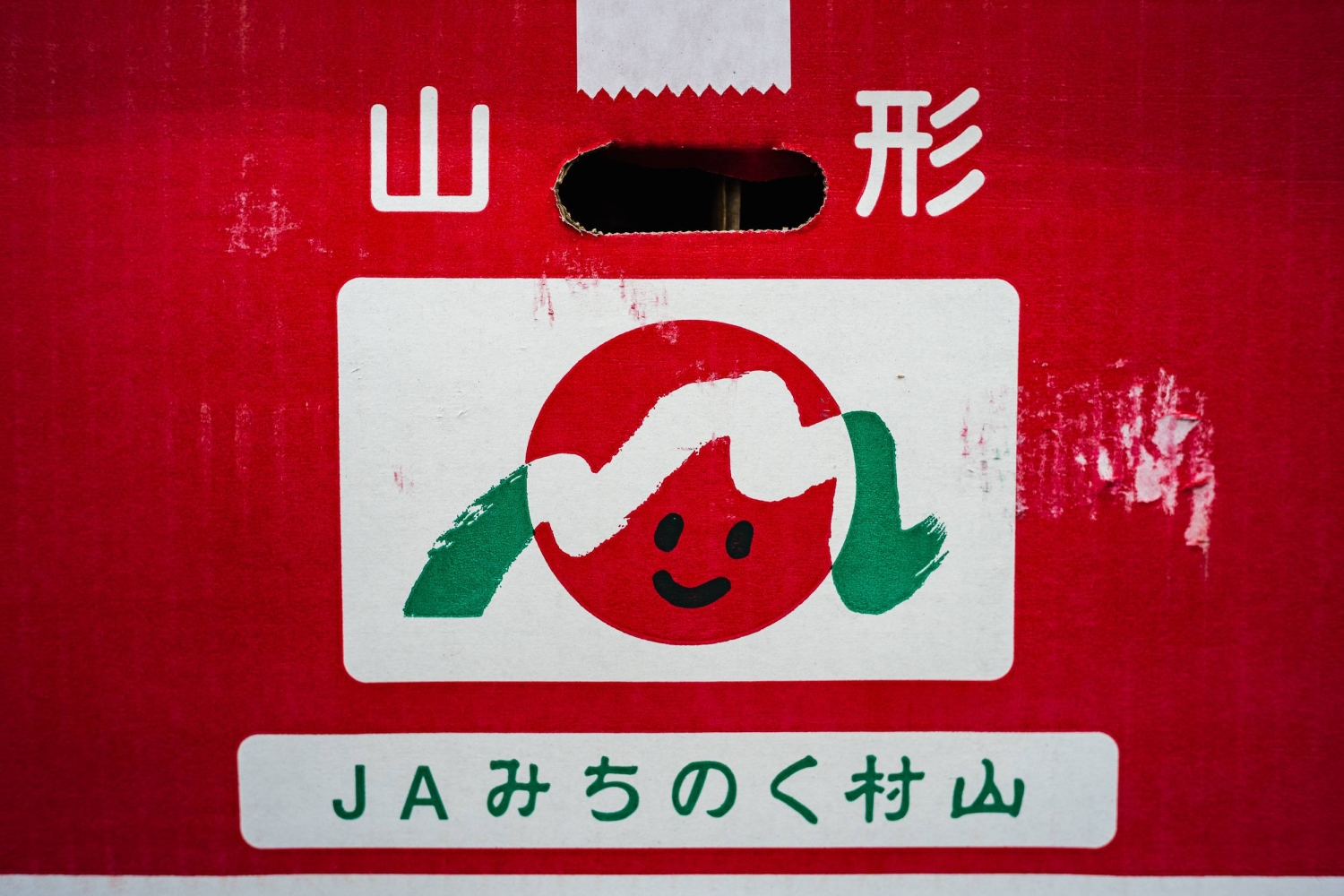 A box from Yamagata Prefecture was busy and hard to decipher, with the logo for JA Michinoku Murayama (one of the country’s many regional agricultural cooperatives) evoking the fruit; although it was probably a red sun rising behind a mountain, it also looked like a cute watermelon having a very bad hair day.