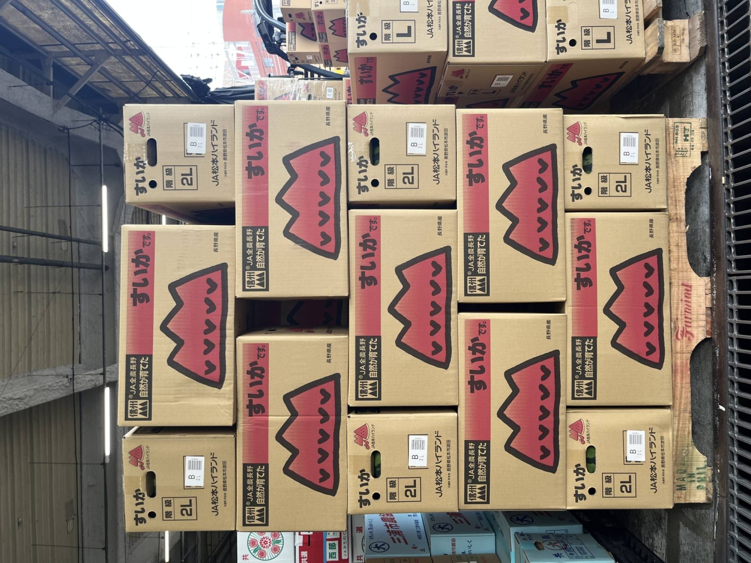 The mountain shape is not only used for the watermelon boxes; it also appears on produce containers from across the prefecture, with the design originating with JA Zennoh Nagano, the umbrella group for the local associations. Heads of green leaf lettuce grown in the southern end of the prefecture come in boxes printed with a (somewhat counterintuitively) blue version of the mountain; bunches of long green onions from the central areas come packaged with the mountain (more fittingly) in green.