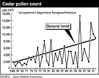 In Tokyo, pollinosis sufferers have almost doubled over the past decade, from 10 percent of the population in 1986 to 19.4 percent in 1996, according to the Tokyo Metropolitan Government.