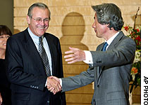 Rumsfeld, who arrived in Tokyo earlier Friday, made no specific requests as for the timing of an SDF dispatch. Instead he thanked Japan for its initiative in pledging financial support to Iraq, calling it a "generous contribution."