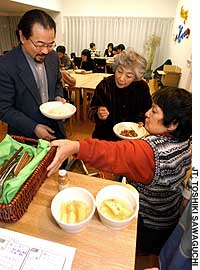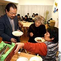 The thrice weekly "common meal" at Kankan Mori is a typical scene, as residents dine together and take turns cooking. After the 7 p.m. meal is served in a large dining room, many of the residents lingered on to continue chatting.