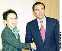 She voiced appreciation for China's efforts to realize a second round of six-nation talks on North Korea's nuclear ambitions, telling Wang that Japan and China have a common goal of achieving a nuclear-free Korean Peninsula, the officials said.