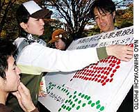 The street polling started in Kanazawa, Ishikawa Prefecture, in early November based on a local housewife's idea. It has now spread to 14 prefectures, including Tokyo, Osaka, Shizuoka, Fukuoka and Okinawa. The participants communicate via e-mail and combine their tallies.