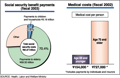According to the National Institute of Population and Social Security Research, 70.4 percent of the 84.27 trillion yen in social security benefits in fiscal 2003 was used by the elderly.