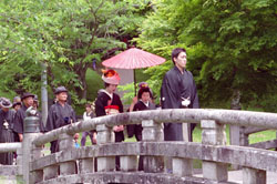 The bride and groom meet on a bridge at the foot of Mount Kirin, after which the wedding ceremony and reception are held in a nearby park.