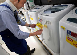 At a Seiyu in Tokyo, a boxy, utilitarian clothes washer from China's Haier selling for ¥19,700 sits next to a curvy, futuristic Panasonic machine selling for ¥137,000.