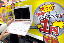 Major electronics retailers Bic Camera Inc. and Yodobashi Camera Co. have since July been selling a package of a netbook computer and an Internet connection card for as cheap as ¥100, or sometimes even ¥1, on condition that customers keep using EMobile Ltd.'s wireless data service for at least two years.