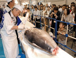 Drawing thousands of people, it features a variety of attractions, including a demonstration each day in which a huge tuna from Misaki Port in Kanagawa Prefecture is cleaned and served to visitors.