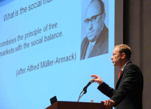 The concept combines market economy with government measures to ensure fair competition, low unemployment and better working conditions and social welfare. Under the model, the state — not the market — ensures social justice, Eilfort explained.