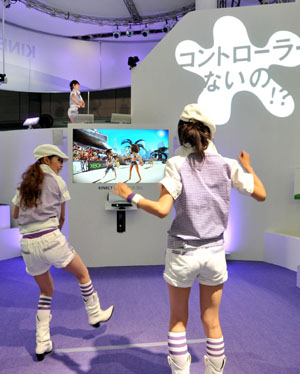 At the Sony booth, many tried out a wireless remote controller, PlayStation Move, that detects the user's movements via both a hand-held sensor and a camera.