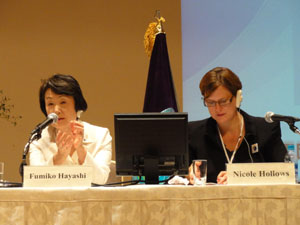 Hayashi, who was Tokyo Nissan Auto Sales Co. President and also CEO of Daiei Inc., said she used to start work at 7 a.m. and return home around midnight while overcoming a male-dominated work environment.
