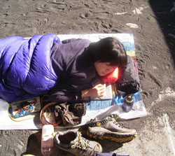 Kato uses a heavy sleeping bag in winter to keep out the cold, and even brings heating pads for extra warmth.