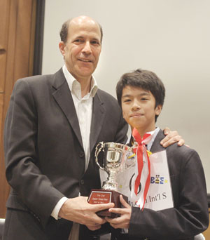 Philsik Chang of KAIS International School challenged Yoshioka to the end by correctly spelling words such as "keeshond," "verbiage," "filibuster," "cynosure" and "coati," but missed on "comestibles" to finish second.
