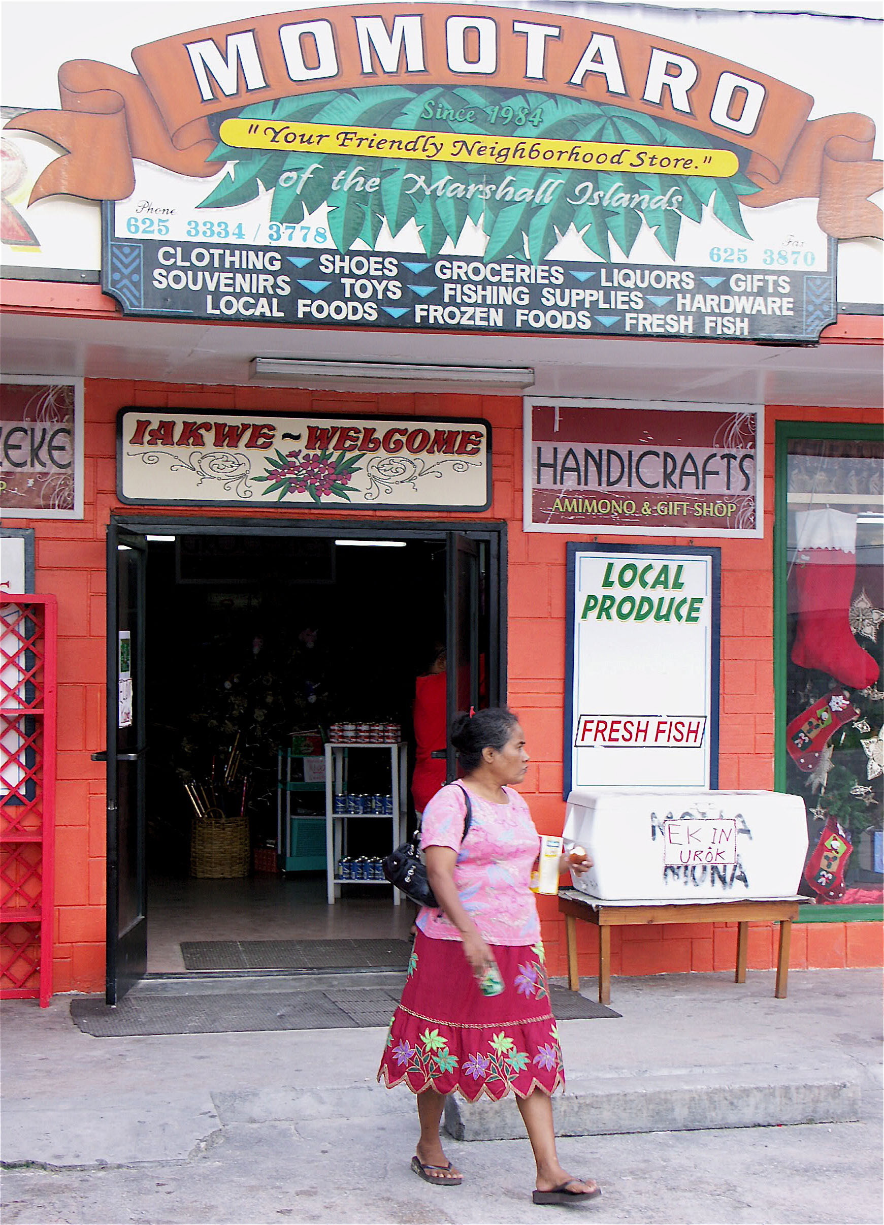 Descending into Majuro in the Marshall Islands, a narrow Pacific coral atoll, feels like landing on an aircraft carrier, with waves crashing on both sides of runway barriers. The airport has old Pacific charm. Passengers walk across the runway, get passports stamped at a little shack, and pass giant ladies in muumuu dresses weaving baskets for sale.
