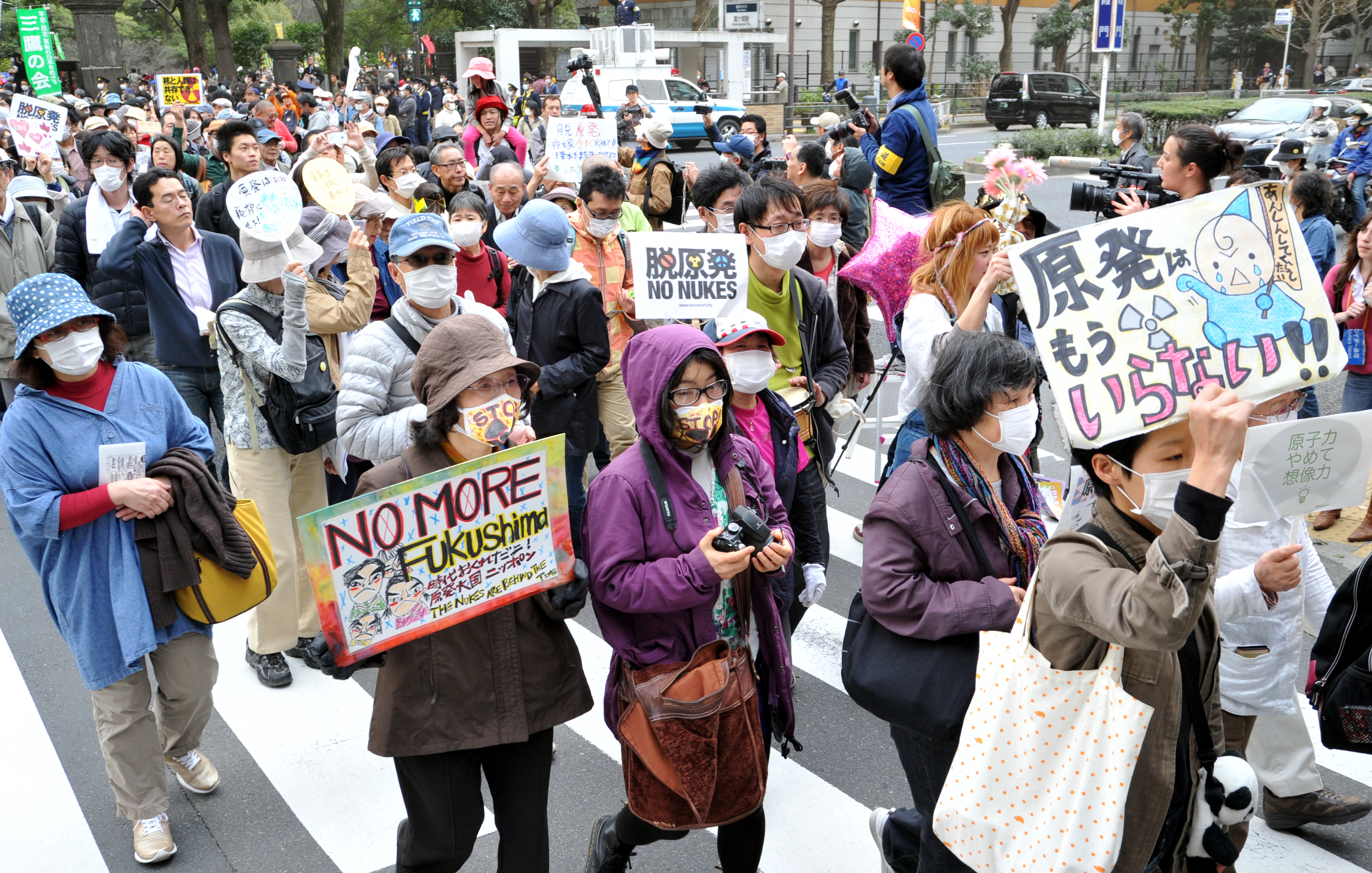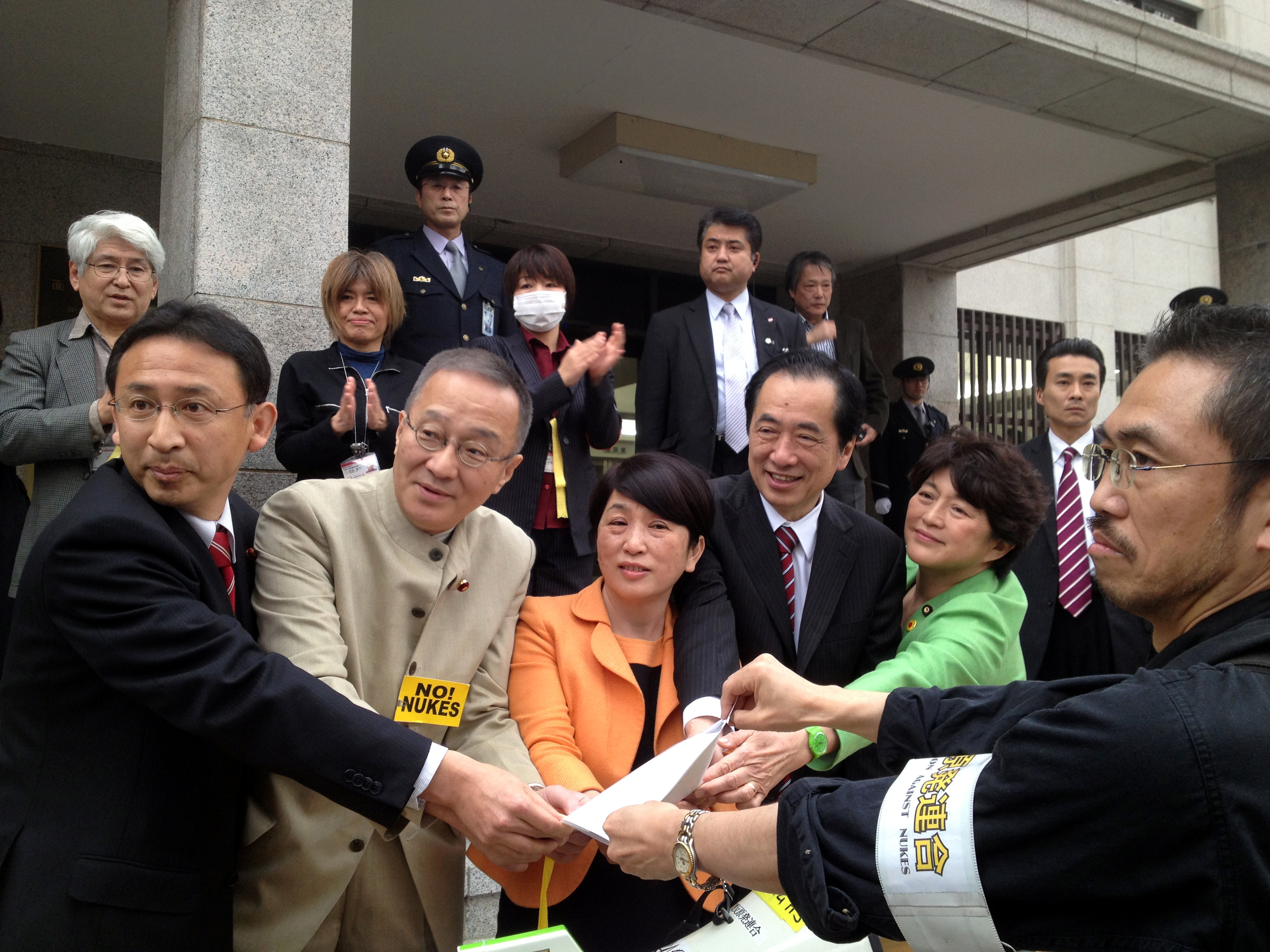 After gathering in Hibiya Park, the demonstrators walked to the Diet building in Chiyoda Ward and submitted petitions urging the immediate elimination of nuclear power to several lawmakers, including former DPJ Prime Minister Naoto Kan, who was in office when the Great East Japan Earthquake struck.