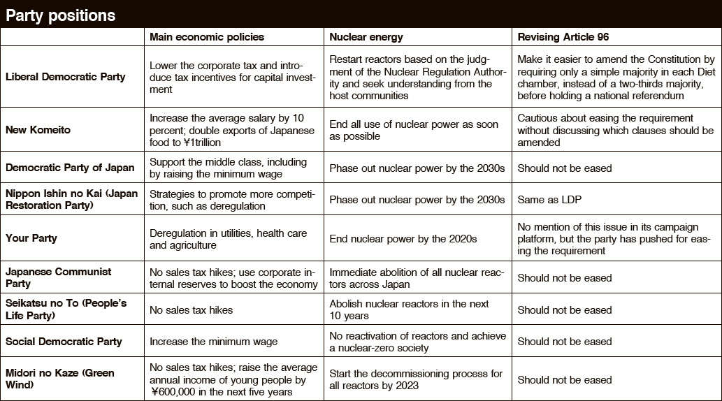 In the opposition camp, only Your Party and Nippon Ishin share the LDP's stance on Article 96. But Your Party decided to jettison the issue from its campaign brochure at the last minute.