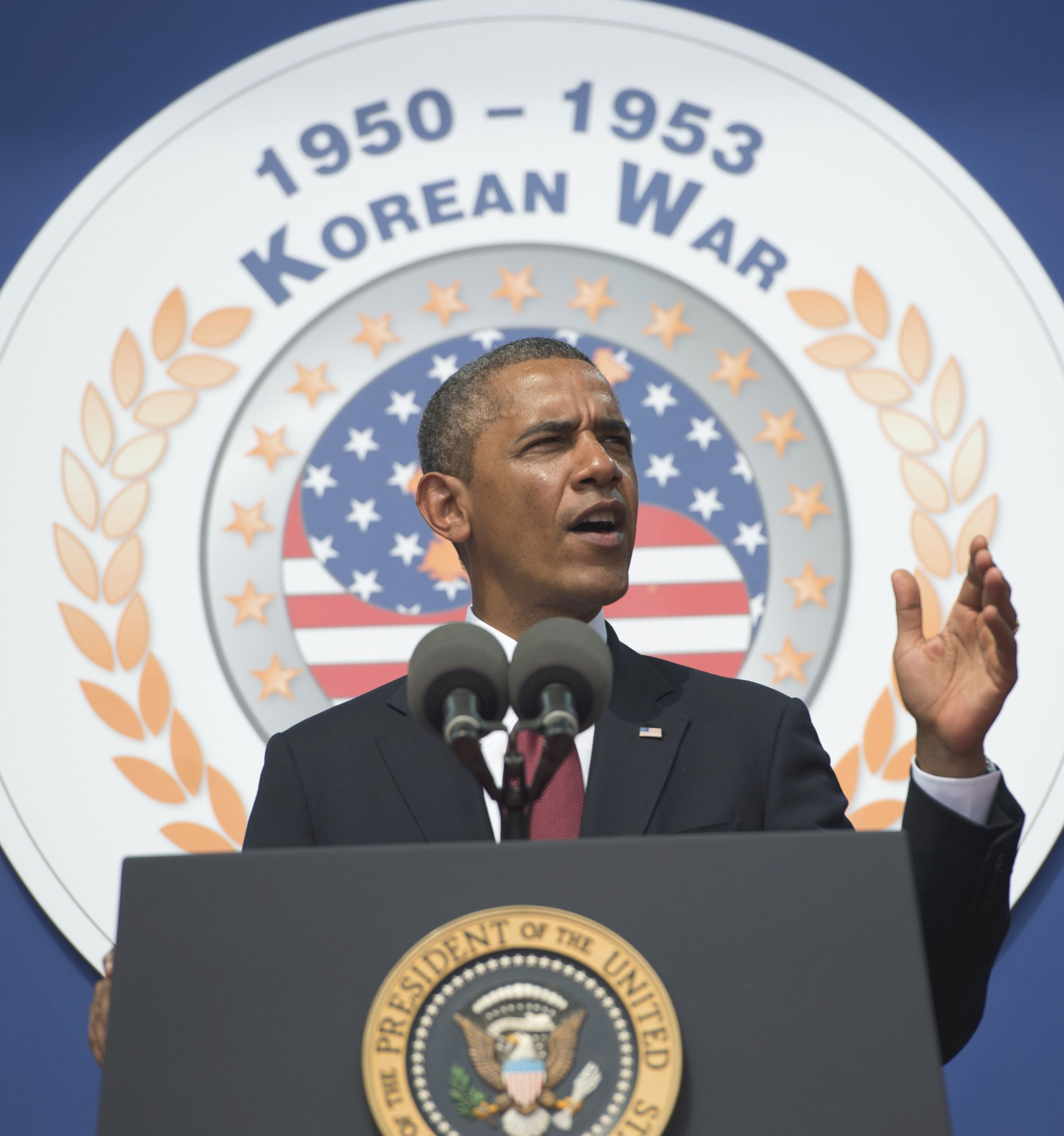 Obama spoke at the Korean War Veterans Memorial to commemorate the 60th anniversary of the armistice agreement that stopped the fighting but did not bring peace to a still-divided peninsula.