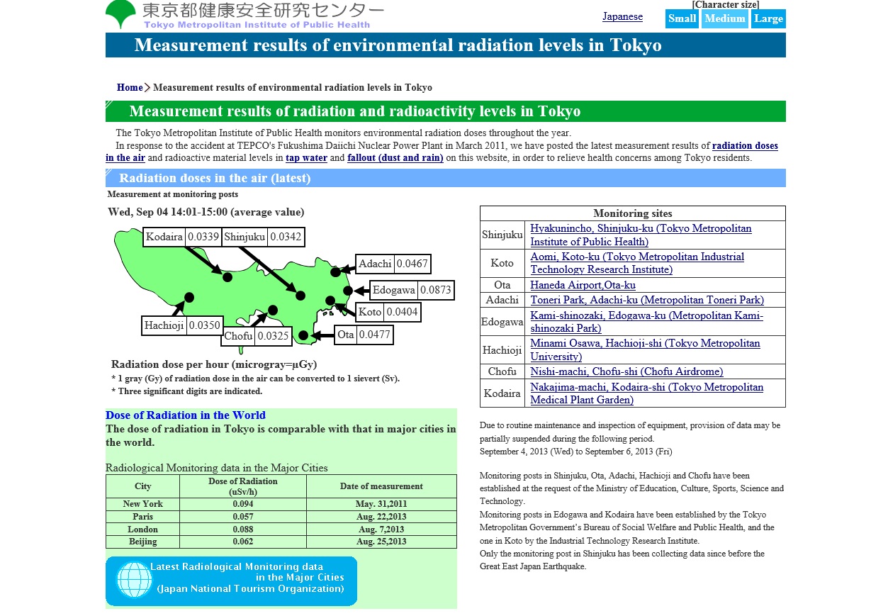 The website — monitoring.tokyo-eiken.go.jp/en/index.html — provides hourly radiation levels monitored at eight locations in Tokyo, including Shinjuku, Ota and Adachi wards, as well as the results of fallout, tap water and food sampling tests conducted by the metro government. The website also provides all of the past radiation readings Tokyo has monitored since 2011.
