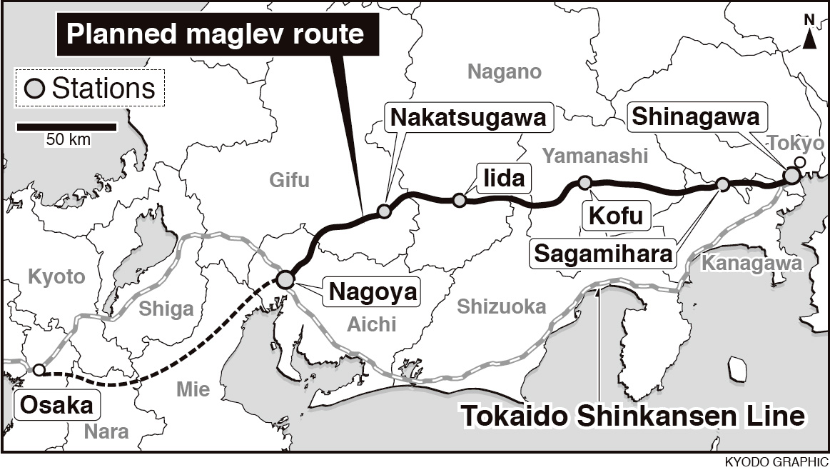 The 286-km section between Tokyo and Nagoya will run through Kanagawa, Yamanashi, Nagano and Gifu prefectures.