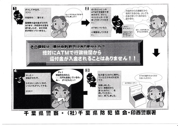 Despite lots of publicity regarding this type of crime, swindlers are getting bolder. In 90 percent of the cases reported in Chiba, the swindler or an agent went to the home of the victim and either picked up the cash directly or, even more amazingly, picked up the victim’s ATM card and then withdrew the money himself.