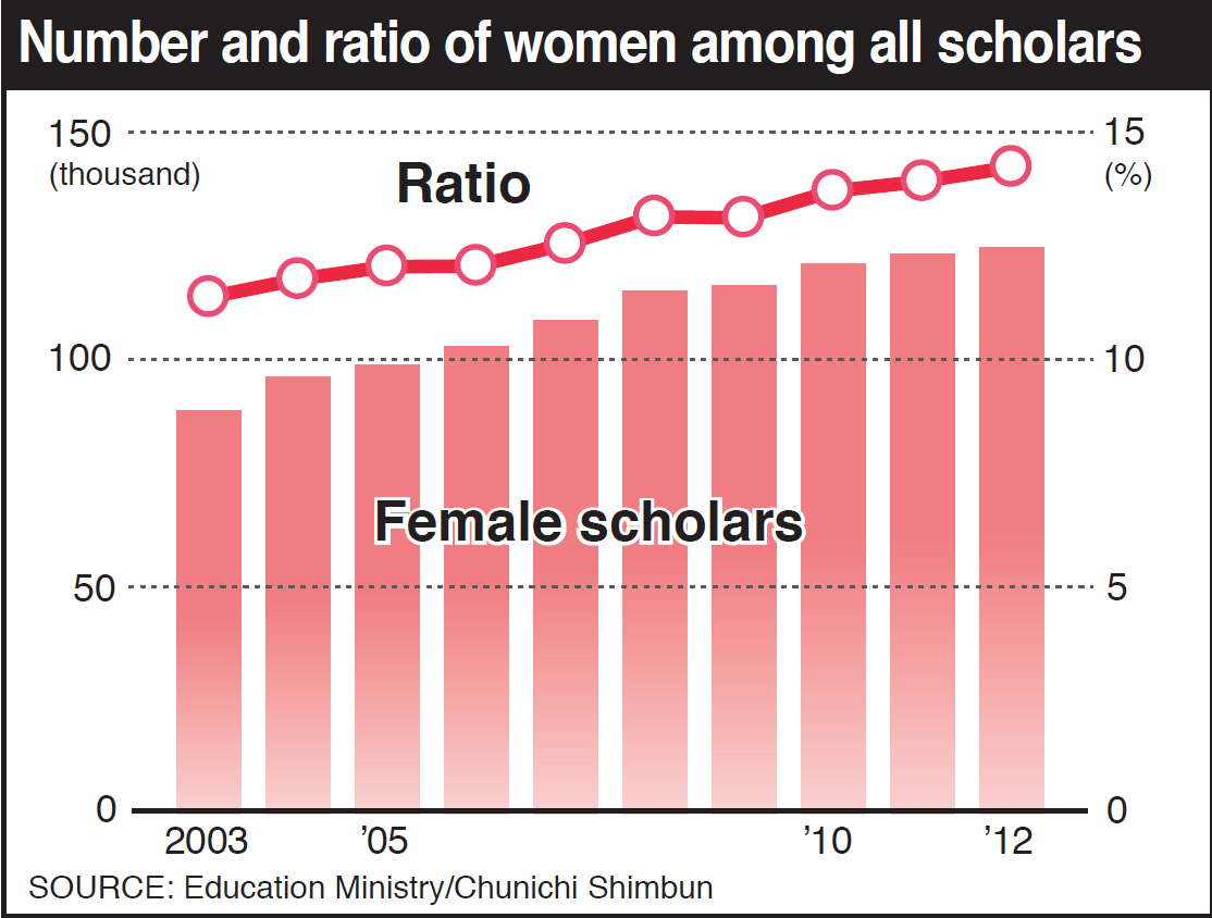 As a result, as of July 2012, the number of female researchers in the science, technology and agriculture fields has climbed to 6.2 percent, and two women in their 30s were promoted to professors.