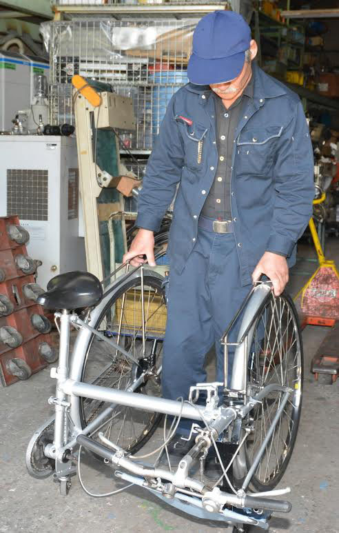To change the bike into a wheelchair, Nagayama, 56, first uses the wrench to remove the pedal. Next, he loosens a screw under the saddle to swing the front wheel around until it is facing the back wheel, creating its frame.