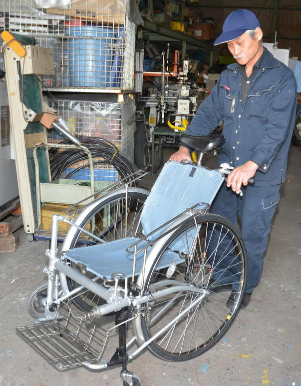 Junji Nagayama, the head of a heavy equipment delivery company in Nagoya, has developed a bicycle that, in just a few minutes, can be transformed into a wheelchair.