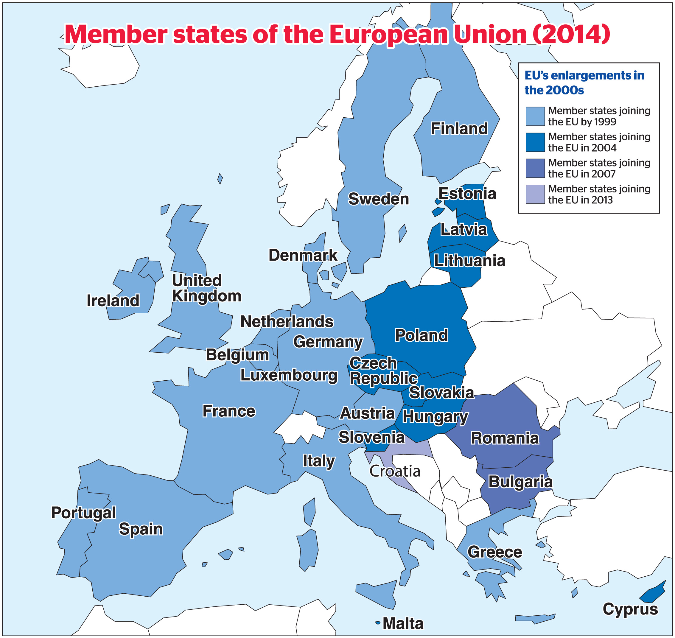 Regarding EU enlargement, Croatia joined in July 2013, bringing the number of member countries to 28, while five others, including Serbia, the former Yugoslav Republic of Macedonia and Montenegro are candidate countries. These moves, aimed at helping countries in the Balkans reach higher levels of reconciliation after the civil wars following the breakup of Yugoslavia, show how essential the EU's existence is to the stability of the Balkan Peninsula.