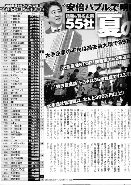 According to Josei Jishin magazine, the biggest bonuses are being given out by trading companies, which makes sense. Trading companies, who do all their business overseas, enjoyed a huge windfall after the government's monetary easing policy forced down the value of the yen.