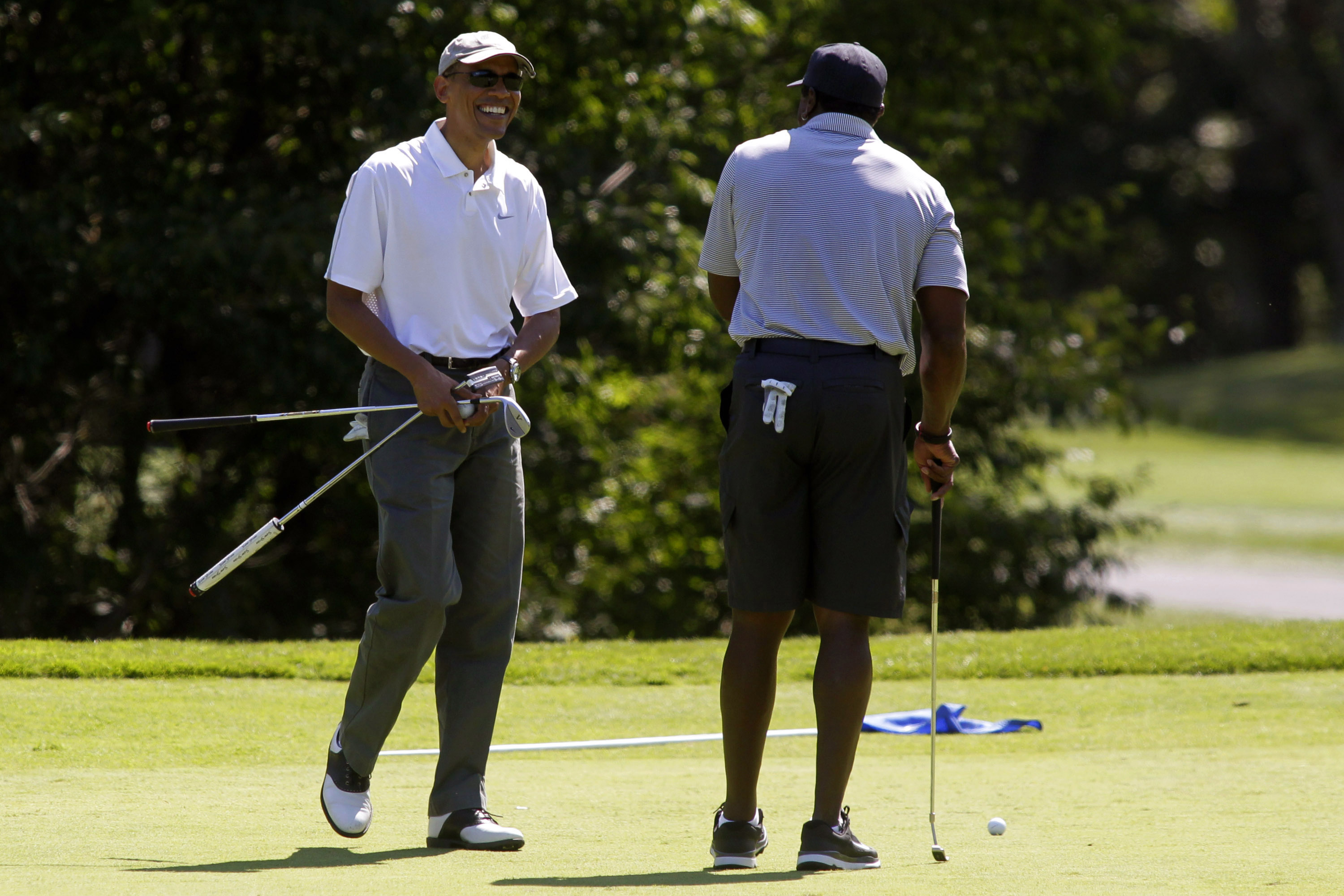 But White House staff allowed press photographers to take pictures of the president with club in hand at the beginning of his Saturday game. That is rare. Journalists seldom get to view the president playing golf, which he does almost every weekend in Washington when the weather is good.