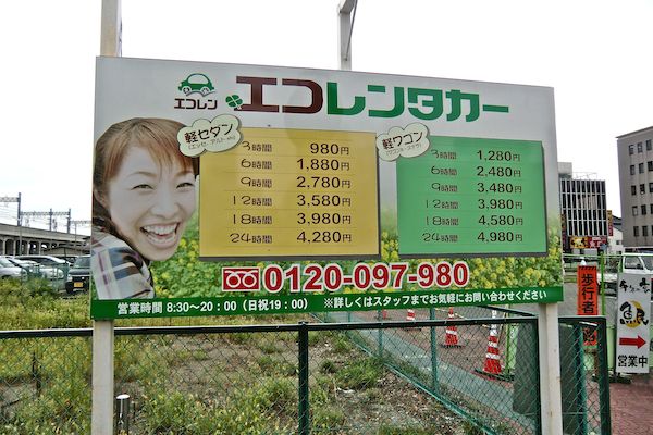 Unfortunately, Eco Rent-a-car isn't nationwide. In fact, it only has two outlets in Gunma — Ota and Ashikaga. On the Internet it appears to have several outlets in the Kansai area, as well using the same logo and offering the same prices. But when we called one of the Kansai offices the person who answered vehemently denied any relationship, saying that they just happened to have the same name and logo, which is difficult to believe. Great— or desperate — minds think alike.