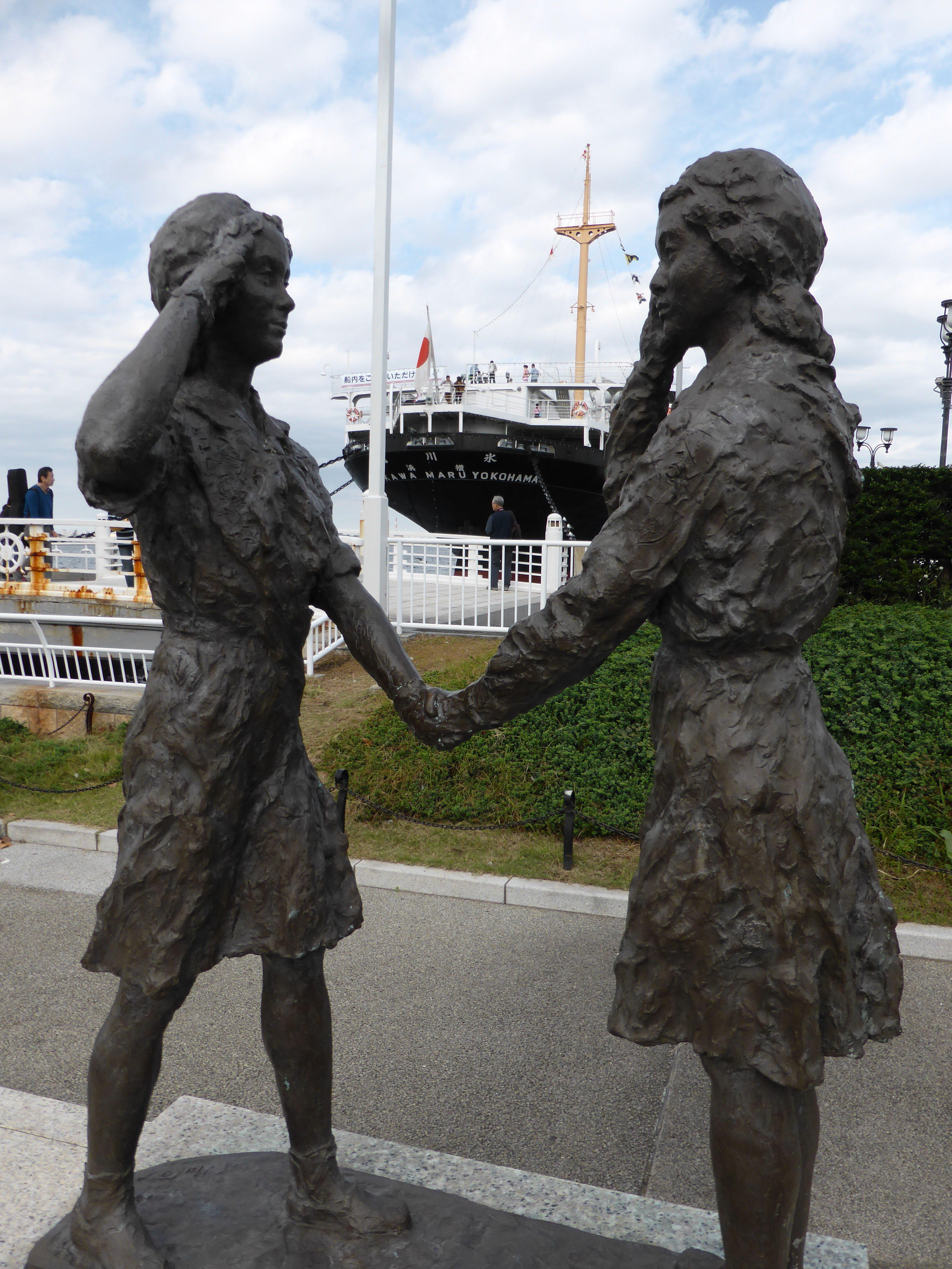 By the shore of Yamashita Park in Yokohama, the city where Japanese and American culture intersect, there stands a statue of three girls. Two are shaking hands while their other hands are raised to their heads to show respect, and a third girl stands beside them.