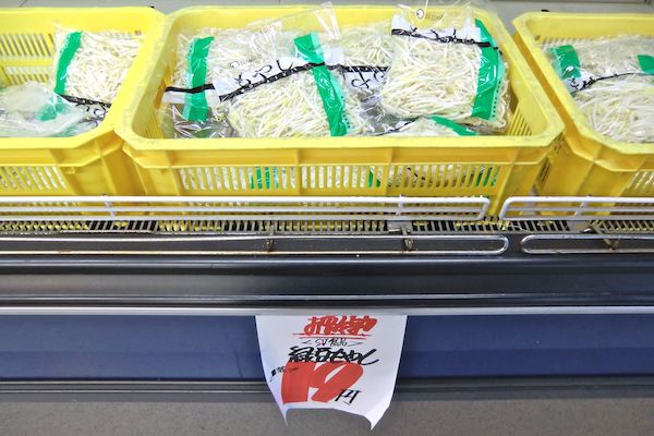 They only buy it because it's as cheap as it is. Since these stores don't make money on it anyway, that wouldn't seem to be a problem, but unlike some other produce moyashi doesn't keep, it has to be sold right away or it spoils, so if the sprouts aren't going to sell, retailers would rather not buy them in the first place. And with implementation of a higher consumption tax in April, there has been even more downward pressure on the retail price.