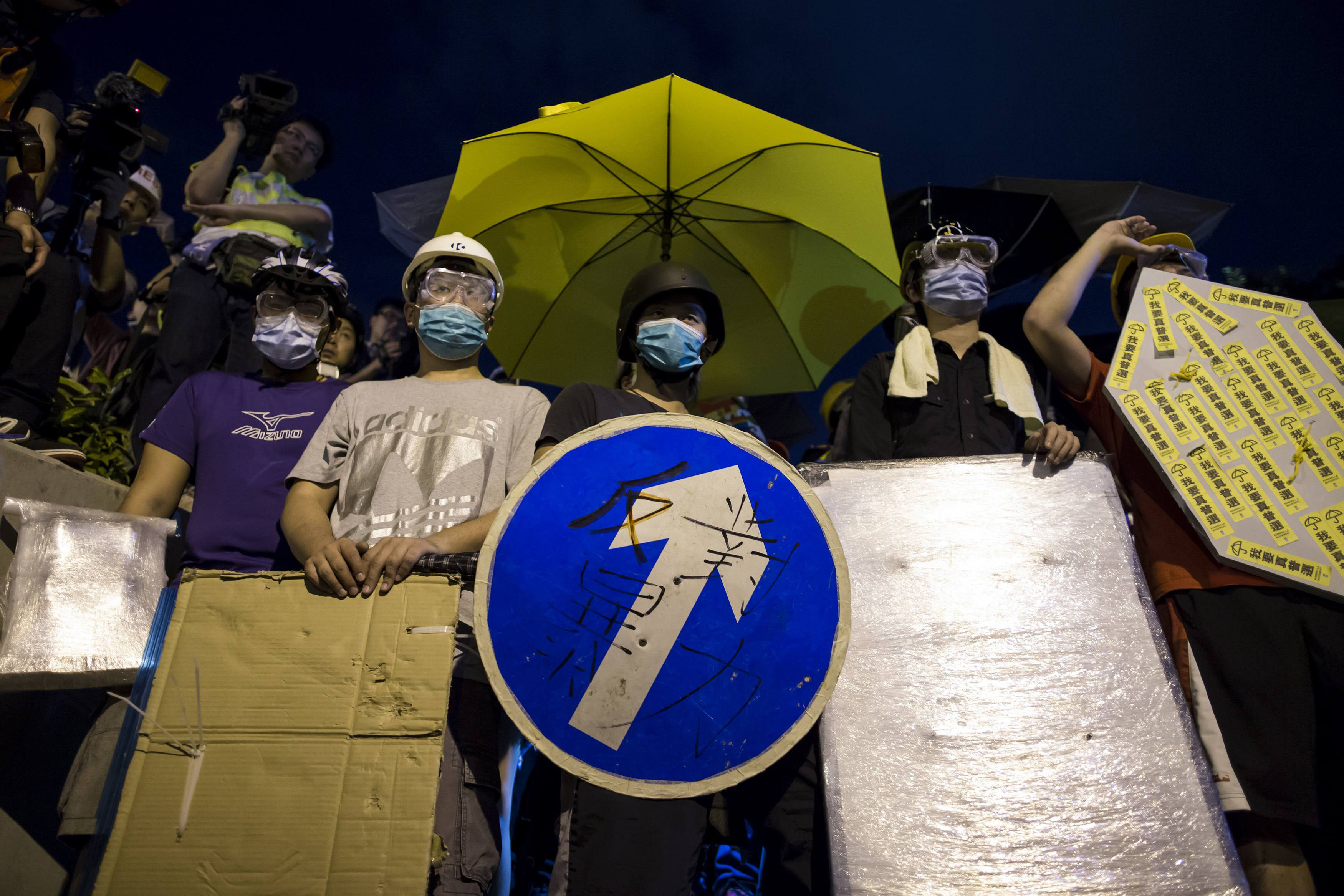 A pro-democracy protester holds a road sign as a shield while standing in front of riot police close to the chief executive’s office in Hong Kong on Nov. 30. | REUTERS8.Hong Kong pro-democracy protests: Activists take to the streets starting Sept. 26, demanding free elections in 2016, after the government announced prospective candidates must be vetted by a Beijing-linked panel.